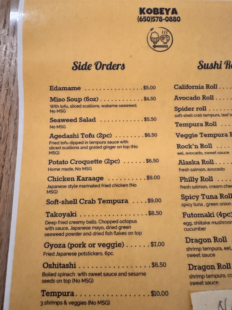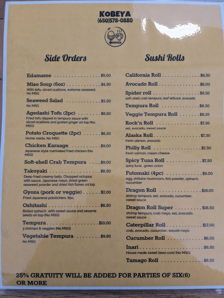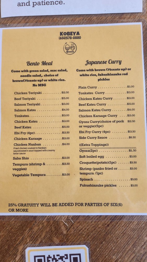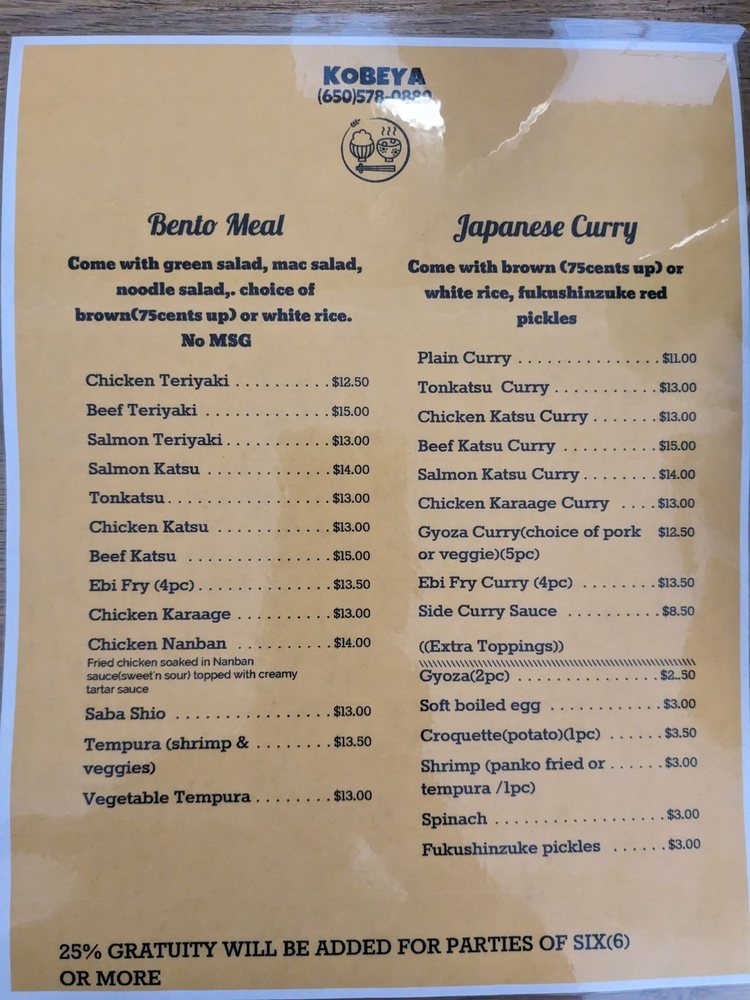 Introducing the menu at Kobeya, a Japanese Curry, Ramen, and Sushi bar located in San Mateo, CA. This casual yet classy restaurant offers a variety of options including takeout, reservations, vegan and vegetarian options, and catering services. With a focus on quality and affordability, customers rave about the delicious bento boxes, sushi, chicken karaage curry, and tempura. The cozy atmosphere, friendly service, and attention to detail make dining in a delightful experience. Whether you're craving a comforting bowl of ramen or a flavorful sushi roll, Kobeya delivers on taste and value. Don't let the unassuming exterior fool you, this gem of a restaurant is a must-visit for those seeking authentic Japanese cuisine in San Mateo.
